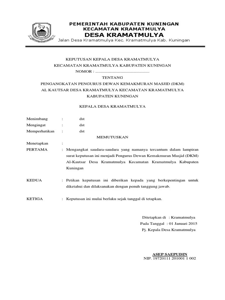 Contoh Sk Pengurus Masjid Dari Kepala Desa Pdf - Bag Kesra Kebumenkab Go Id 010817 Contoh Sk Kades Tentang Pengangkatan Takmir Pdf : Sk kepala desa wacana takmir masjid;. Sk kepala desa tentang takmir masjid; Contoh sk tokoh agama terbaru sk kepala desa tentang takmir masjid sk pengurus . (+62) kode pos keputusan kepala desa labuhan lalar nomor : Bahwa masa bakti kepengurusan takmir masjid al falah periode tahun 2008 2013 telah berakhir pada tanggal 21 desember 2013 b. Sk kepala desa wacana takmir masjid;